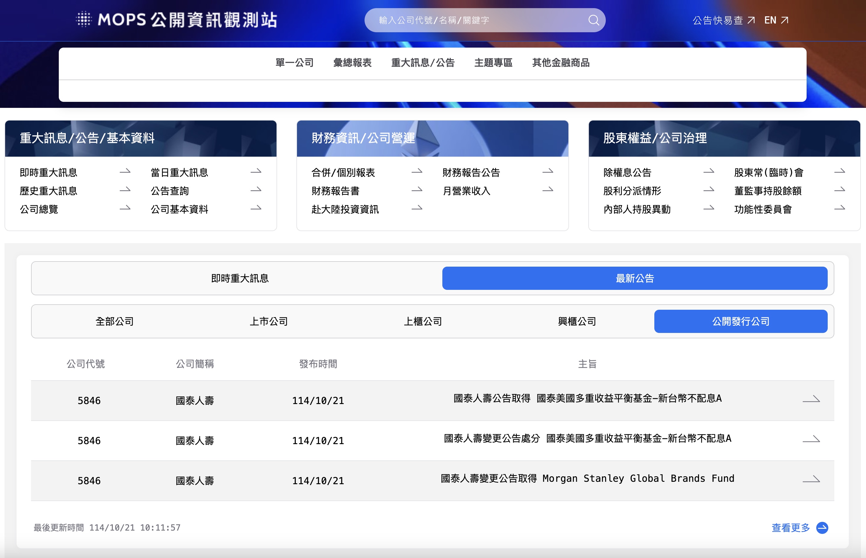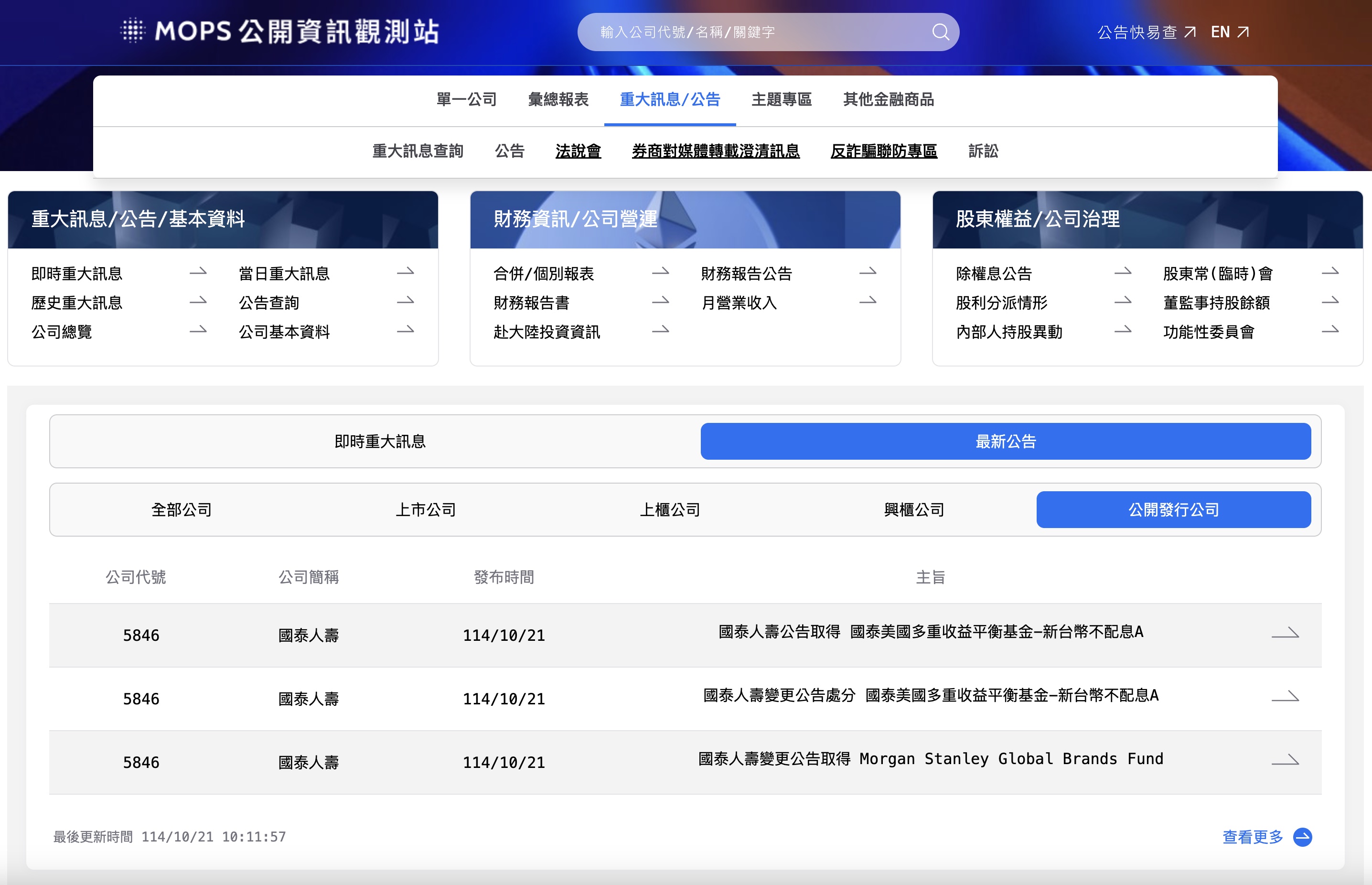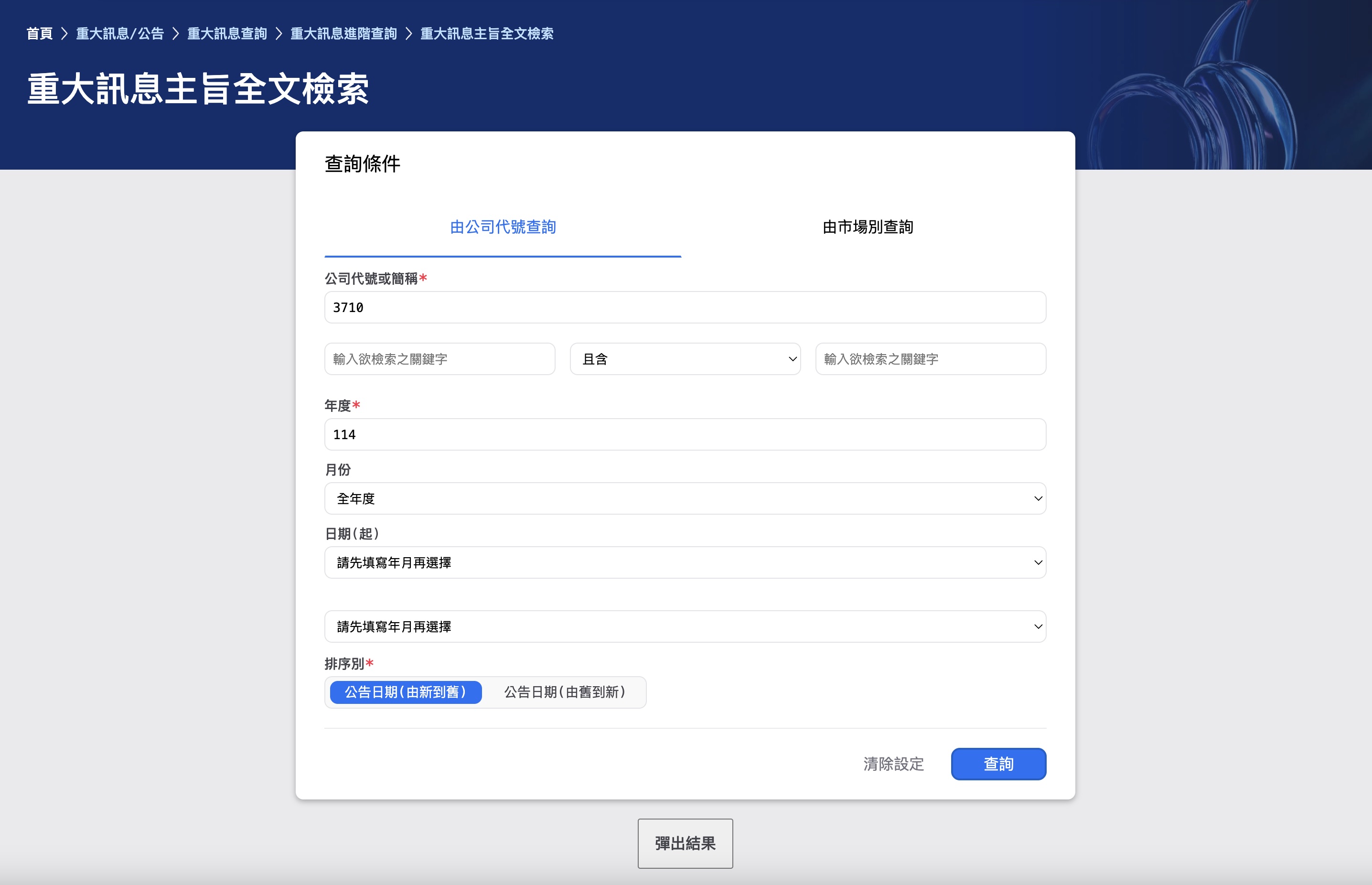 步驟4:輸入公司代碼3710及查詢年度,按下搜尋即可查看該年重大訊息公告