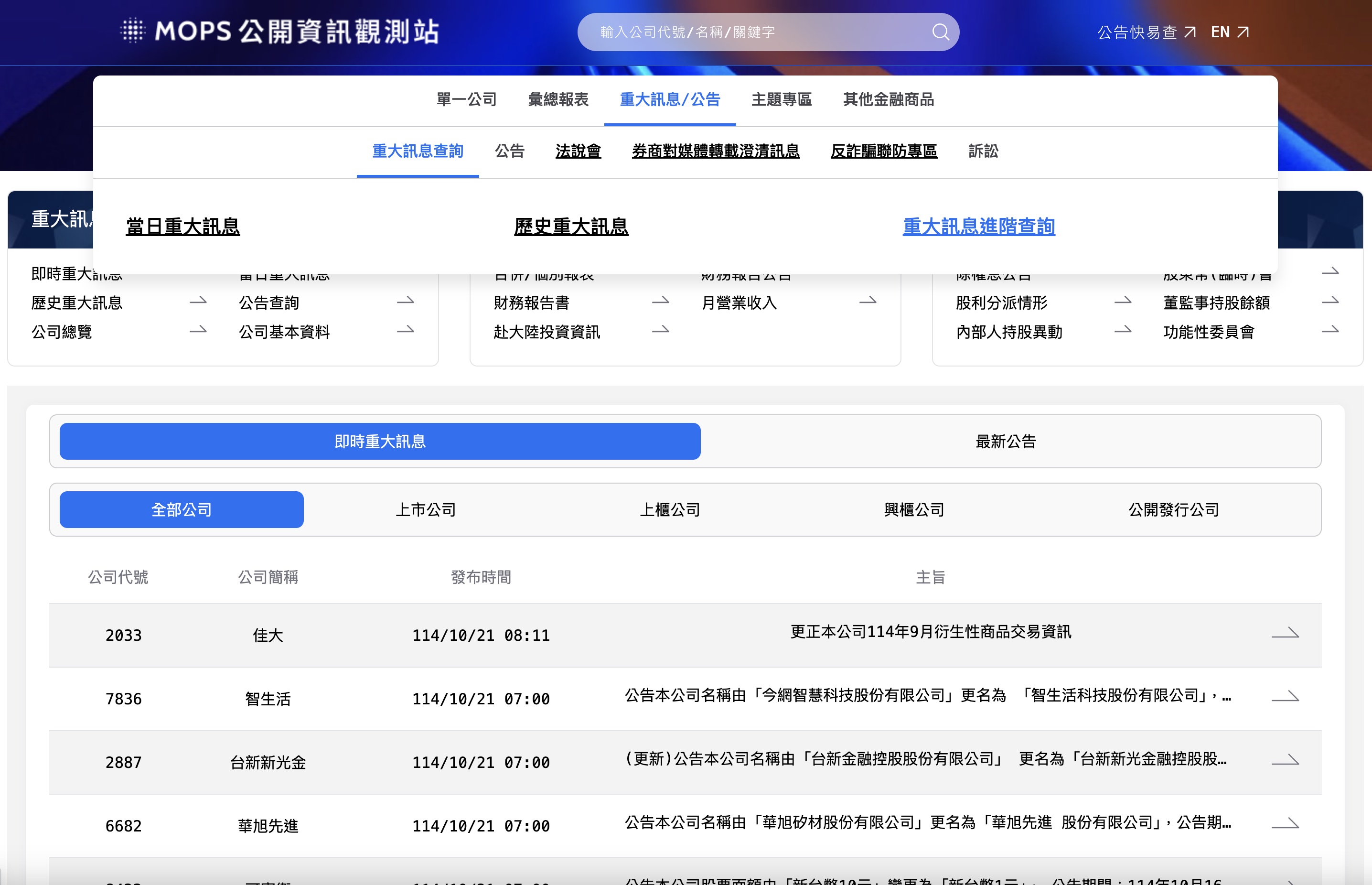 步驟3:選擇重大訊息查詢>重大訊息進階查詢